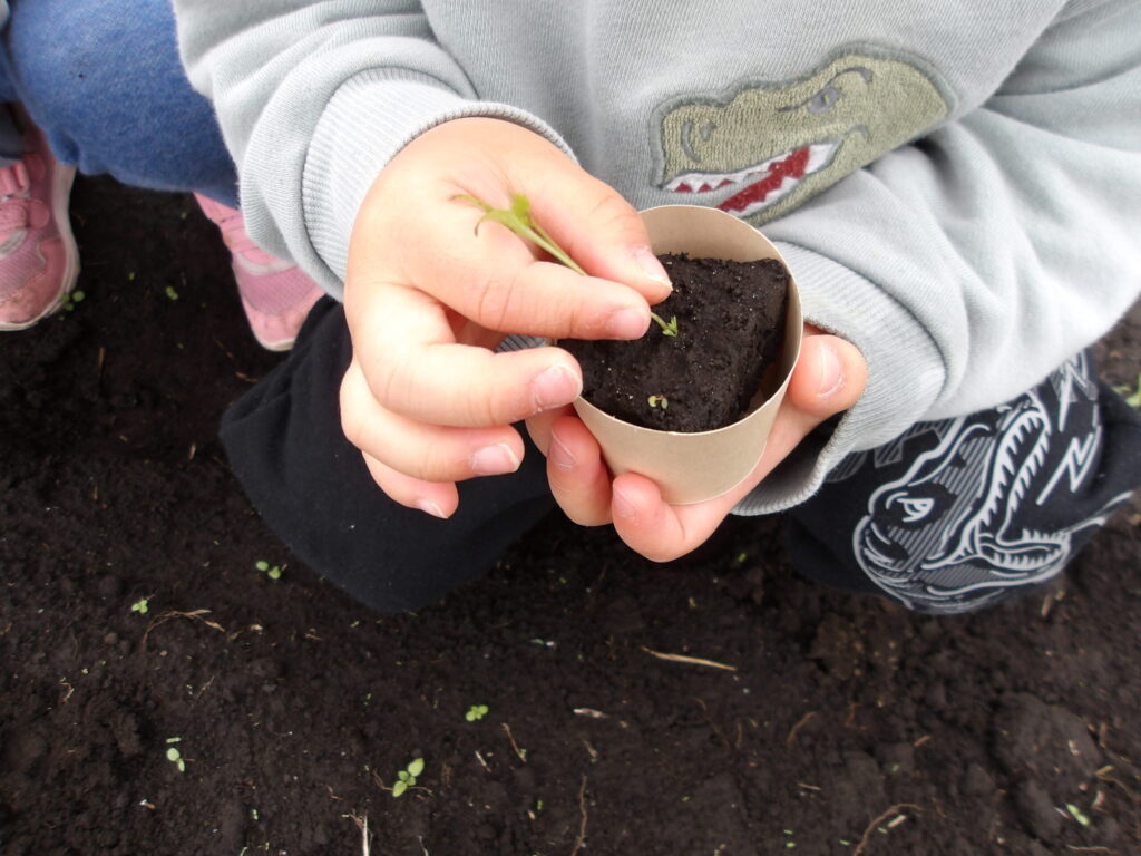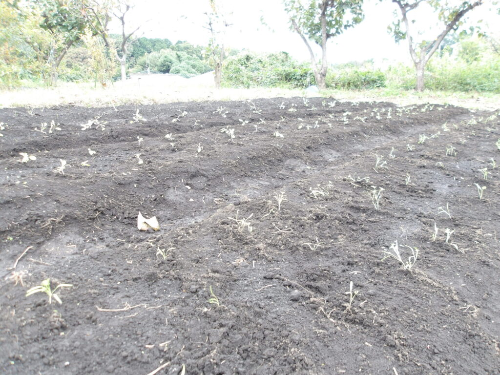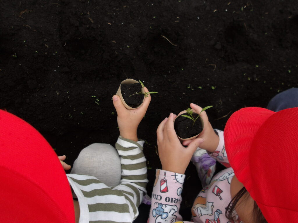 大根・人参・かぶ・ごぼうの4種類の種が発芽したので、畑に植えに行きました。まだまだ小さな芽です。こどもたちはとっても優しく手の平にのせ、優しく土のお布団を掛けてくれました。「大きくなってね」と願いを込める姿も見られ心が温かくなりました。「大きくなったら豚汁かな。おでんかな。」とこどもと職員とで楽しそうに想像を膨らませていました。大きく育ちますように…