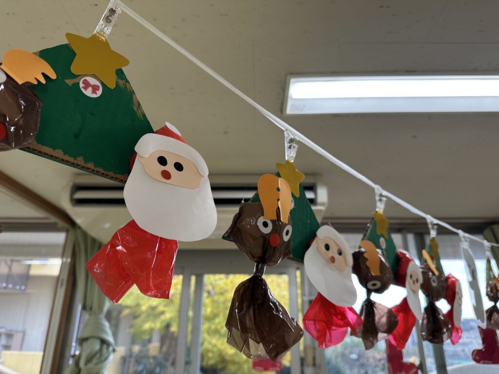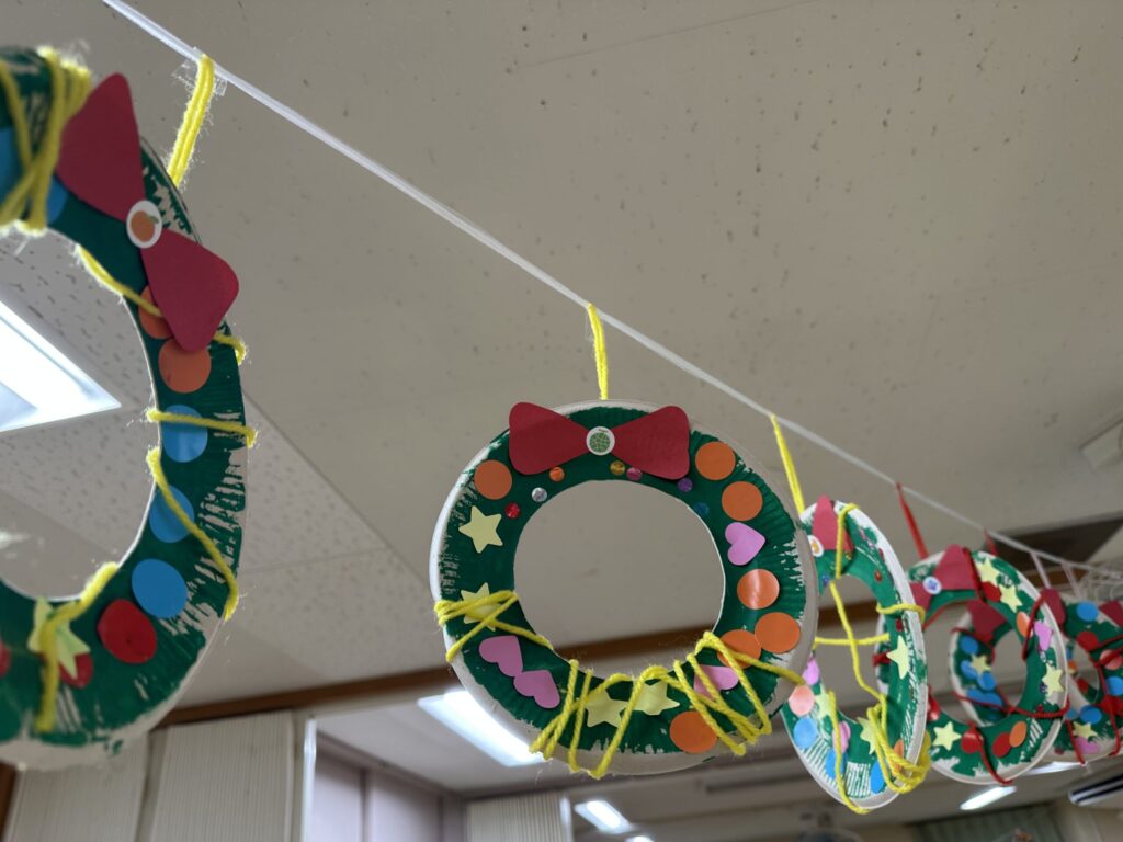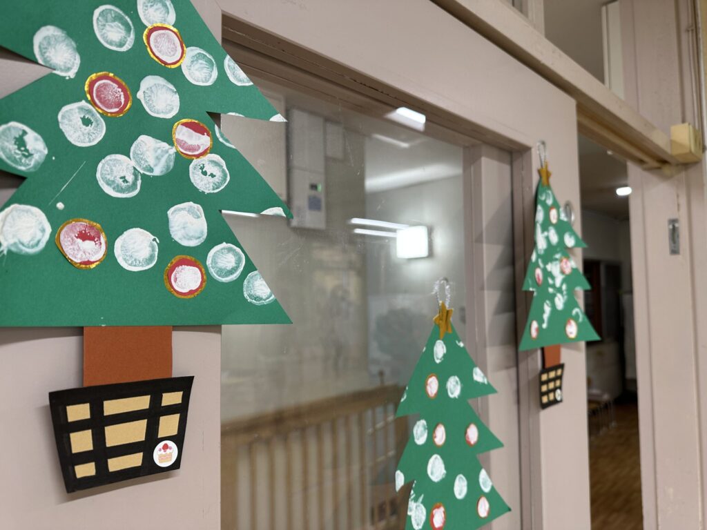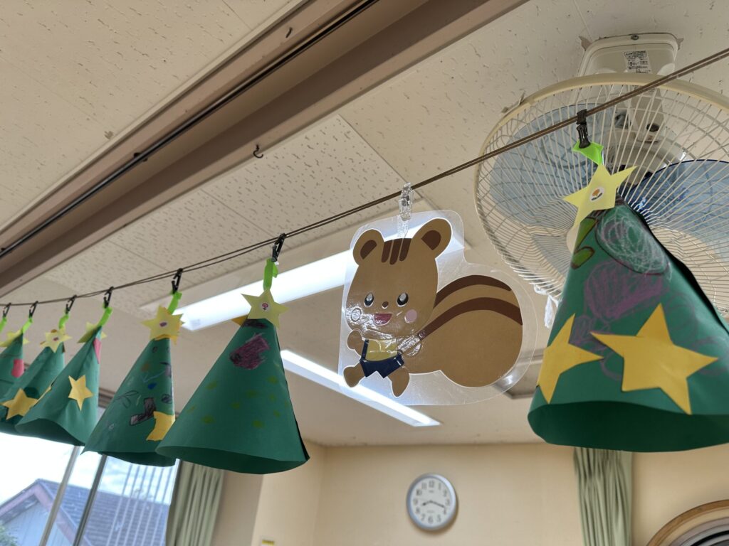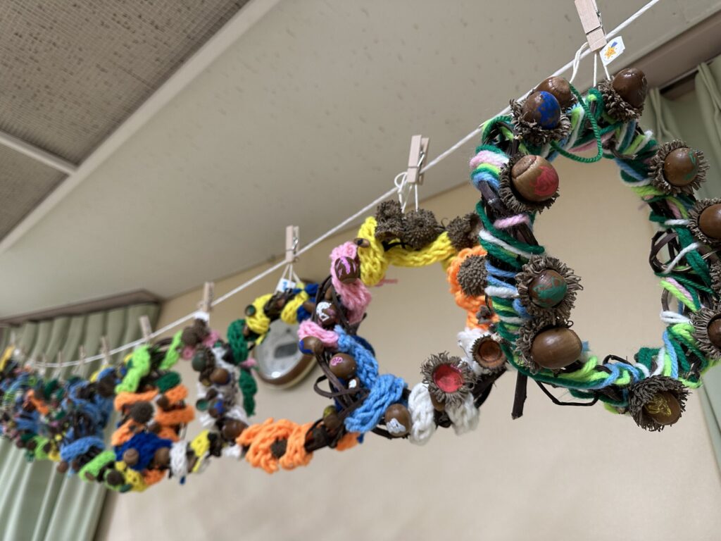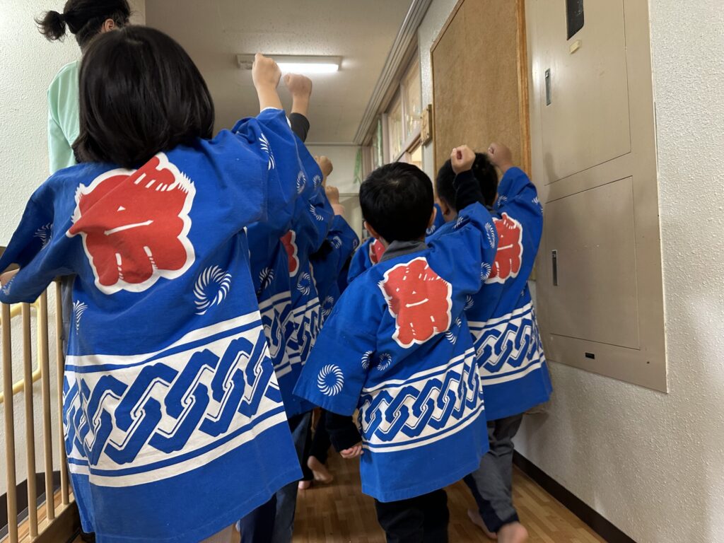 小山保育園のフェスティバルは、ふだんの保育の様子をおうちの方に見ていただいたり、親子一緒に歌を歌ったり、一人一人の得意な部分を見てもらったりと普段の保育の延長線上で行われる会です。今年の年長児はお話を一から作り、話し合いを重ねていました。当日も演者であるこどもたちのその時の感情で演じ方やセリフが変わります。楽しく演じている姿に頼もしさを感じた年長児でした。0歳児はアコースティックギターと手作りマラカスで、大好きなお父さんお母さんと一緒にきらきら星やおもちゃのチャチャチャを歌い、とても温かな時間が流れました。会場にはこどもたち手作りの作品が並びました。