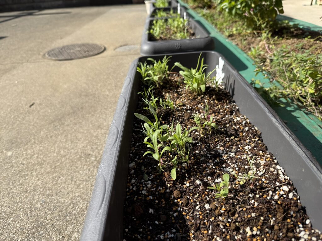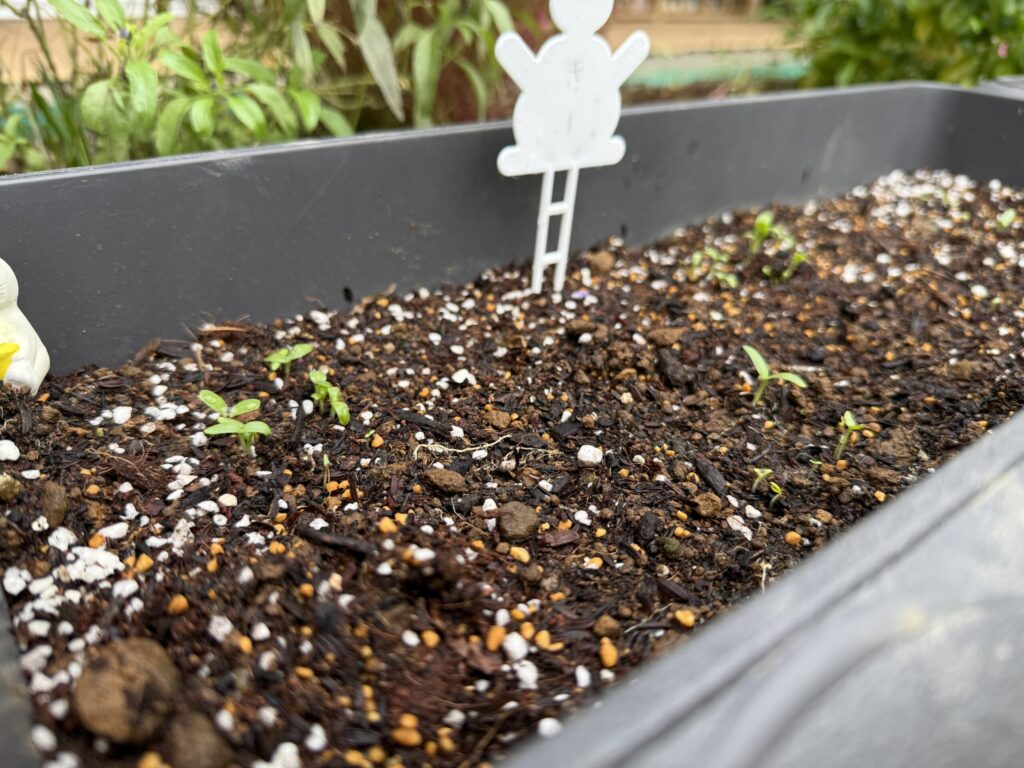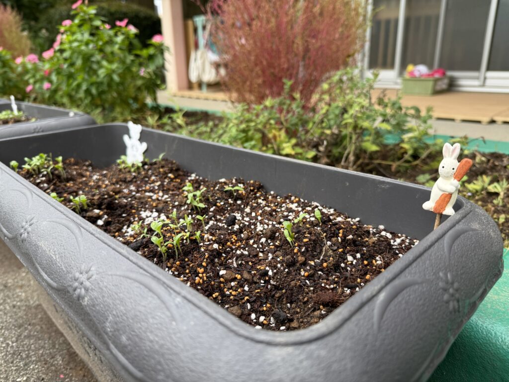 みんなで植えたたねだんごから芽が出てきました。栄養たっぷりのだんごの力はスゴイ!こどもたちの丸める加減も良かったのかたくさんのかわいらしい芽が出てきました。水やりを行いながら、成長を楽しみにしています。
