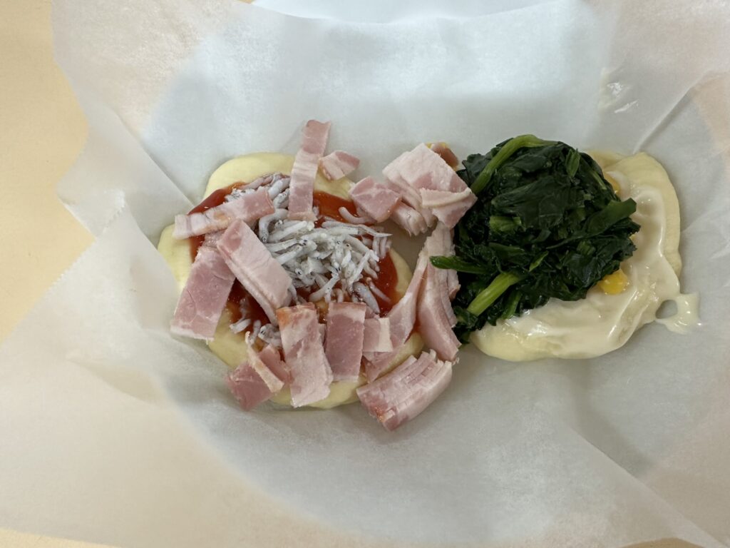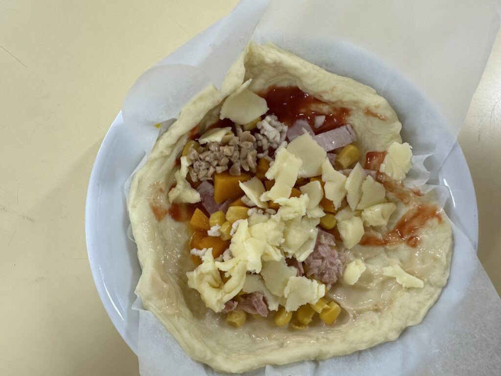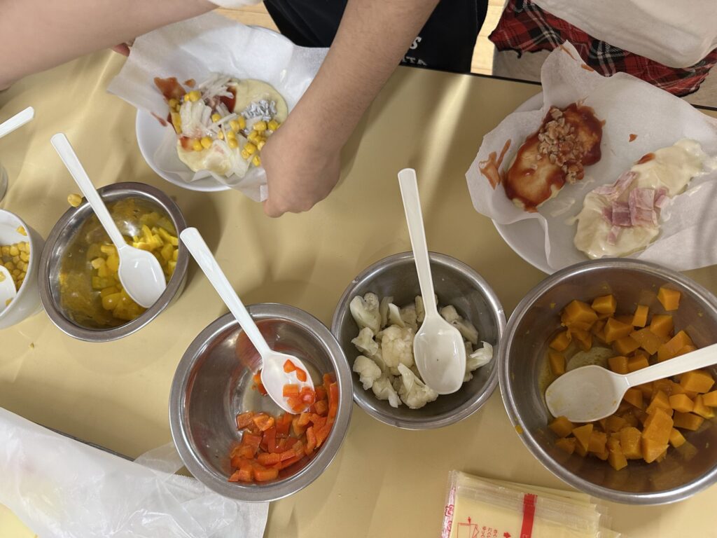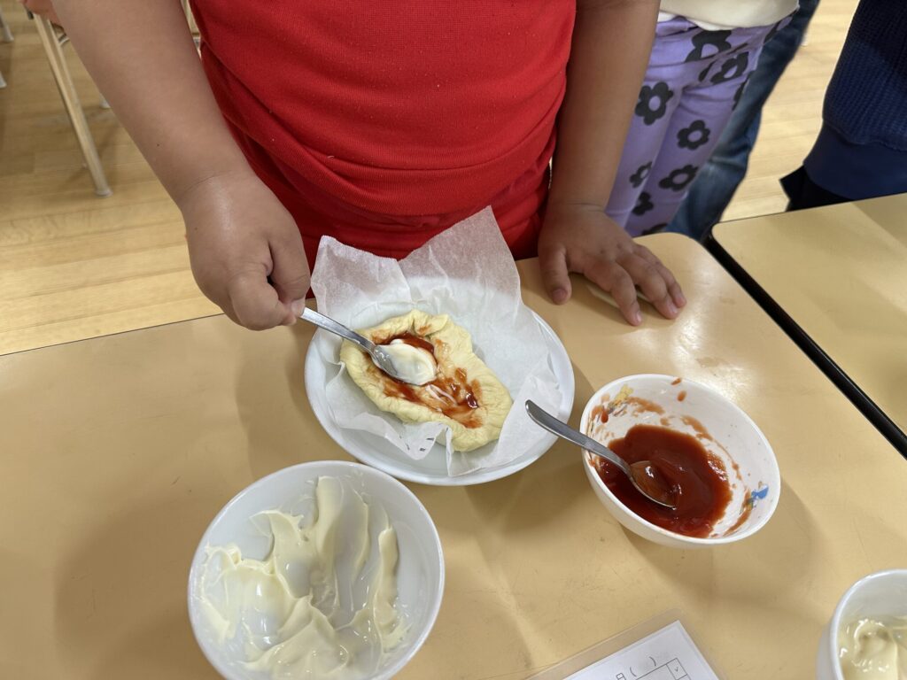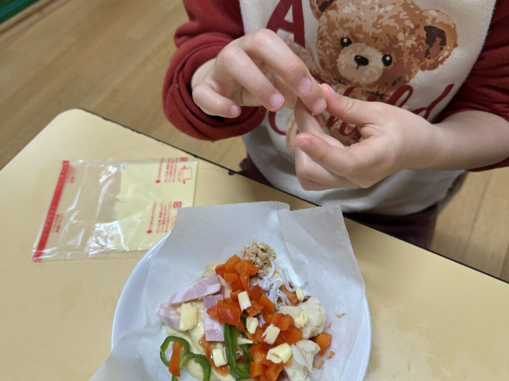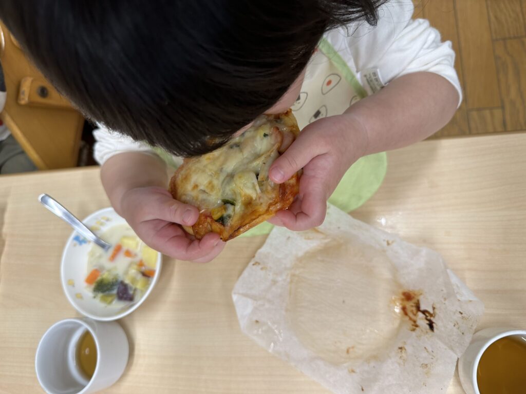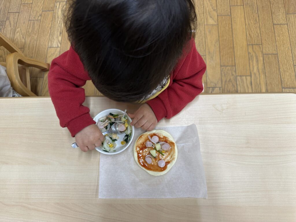 今日は保育園全員でピザパーティー。給食の先生達は朝から準備に大忙しです。午前中はそれぞえれの保育室でピザ作りが開始されました。0.1歳児クラスはお皿に混ざっている具材を生地の上に載せます。2歳児クラスは生地を触ってみることにも挑戦。3歳児クラスは生地を延ばし、4歳児クラスはその場で収穫したミニ人参をピザにのせるというおしゃれピザ作り。5歳児クラスは5つのソースと事前にリクエストした具材のバイキング。いろんなピザに出会えて、とっても楽しいピザパーティになりました。自分で作ったピザは格別でとっても美味しそうに頬張っていました。