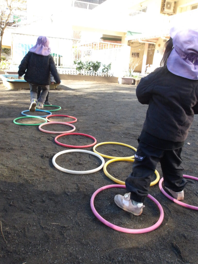 ポカポカと温かく春らしい日和ですね。こども達は元気いっぱい園庭で遊びました。最近の園庭では様々なお店屋さんが開店してます。お薬屋さん・ジュース屋さん・アイス屋さん・パンケーキ屋さん。甘いお菓子が大人気です。そしてもう一つの流行はフープ。大きいフープと小さいフープがあります。腰で回すだけではなくフープを並べてケンケンパや音楽に合わせてグーパーで進んだり、フープに乗り転がしながら進む…という技?!に挑戦する子もいます。コマのように回してどれだけ長く回転しているかを競ったり。自分より大きい子の遊びをまねたり、工夫しながら新しいことに挑戦するこども達の力はスゴイなぁと改めて感じました。
