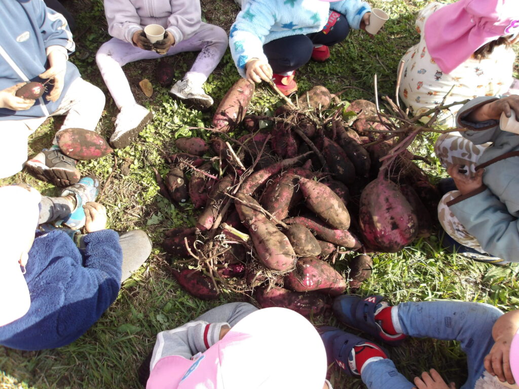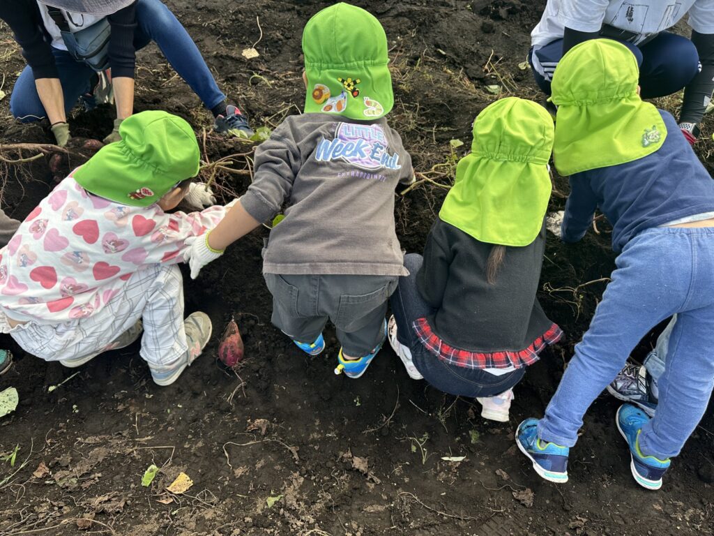 2日間に渡ったさつまいも掘り。5月に苗を植えてから、一生懸命に育ててきたさつまいもの収穫を迎えました。土の中のさつまいもは大きく育っているかな…と不安な気持ちもありましたが、掘ってみるととっても大きなおいもに生長していて一安心。あまりの大きさに「大きい!」とこどもたちも本腰を入れて挑みます。「助けてくださーい」と職員からも応援を呼ぶ声が上がります。0歳児クラスから5歳児クラス全員で土まみれになりながらさつまいもとの格闘が繰り広げられました。天候にも恵まれ最高のさつまいも掘りになりました。今年の収穫量は99キロ!!給食でどんな料理に変身するか楽しみです。